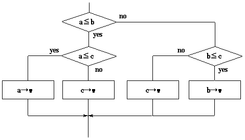if(a<=b){ if(a<=c) w=a; else w=c; } else{ if(b<=c) w=b; else w=c; } }